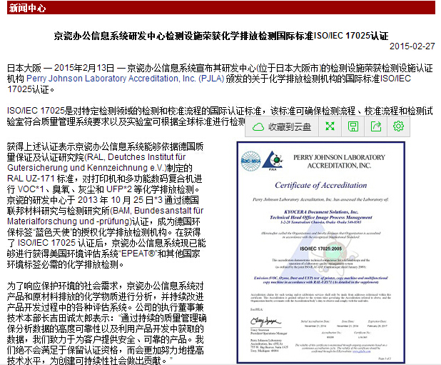 京瓷办公信息系统研发中心检测设施荣获化学排放检测国际标准ISO/